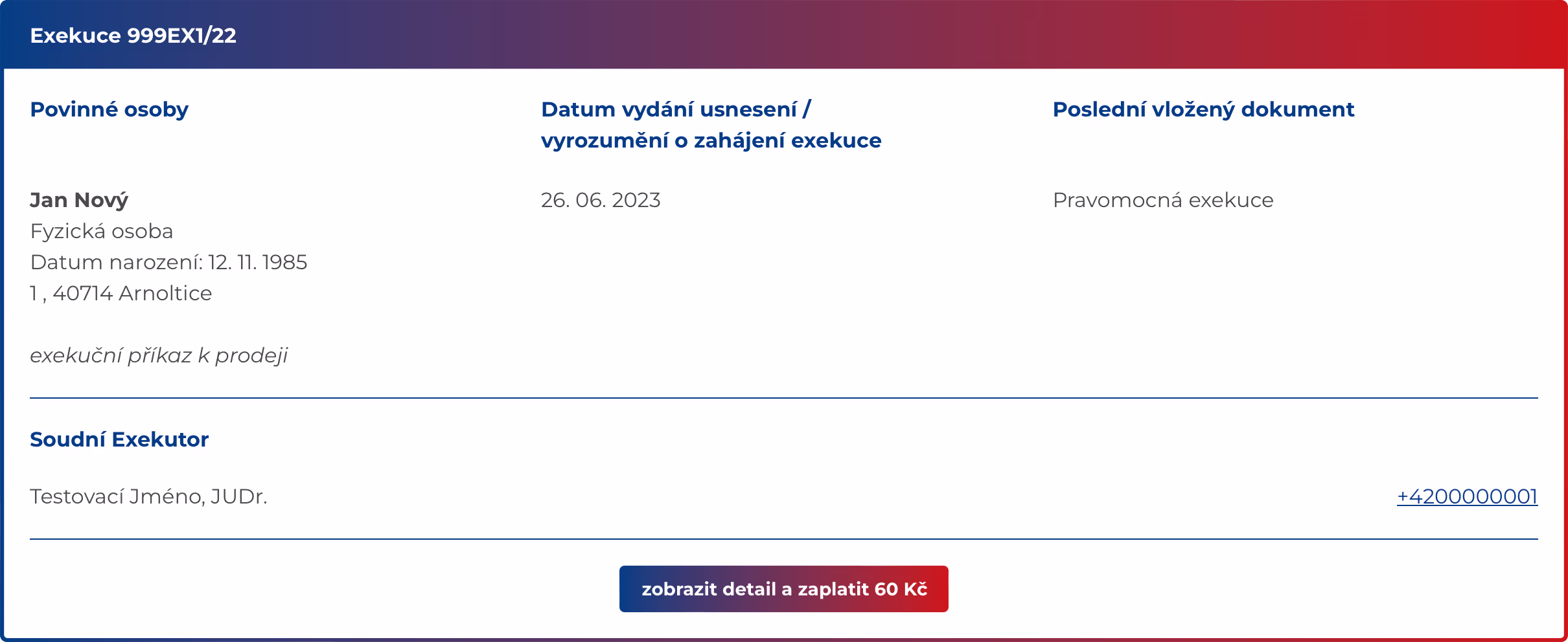 Při shodě se vám zobrazí výpis exekučních řízení, u kterých je možné za poplatek 60 Kč zobrazit detail.